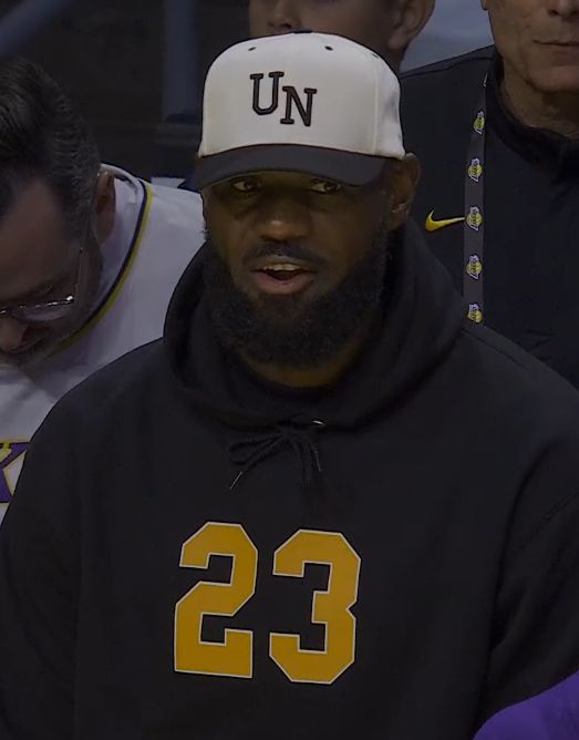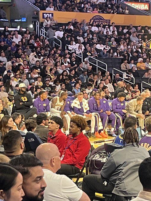 湖人记者Mark Medina晒出现场照,勒布朗坐在一张更高的椅子上,紧挨着他的队友们,推测这是为了缓解他的坐骨神经痛。